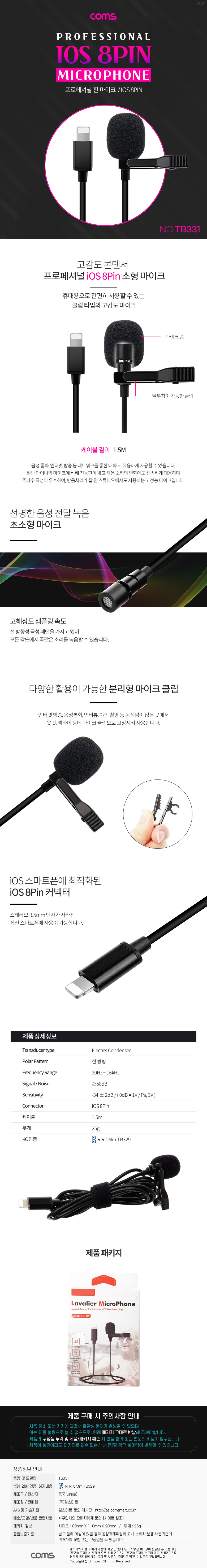 [300280]Coms(ÄĽº) iOS 8ÇÉ(8Pin) ¸¶ÀÌÅ©, Ŭ¸³Çü, ¼ÒÇü, ¹Ì´Ï, Çɸ¶ÀÌÅ©, ÇÉ ¸¶ÀÌÅ©, 1.5¹ÌÅÍ(1.5m) [TB331]