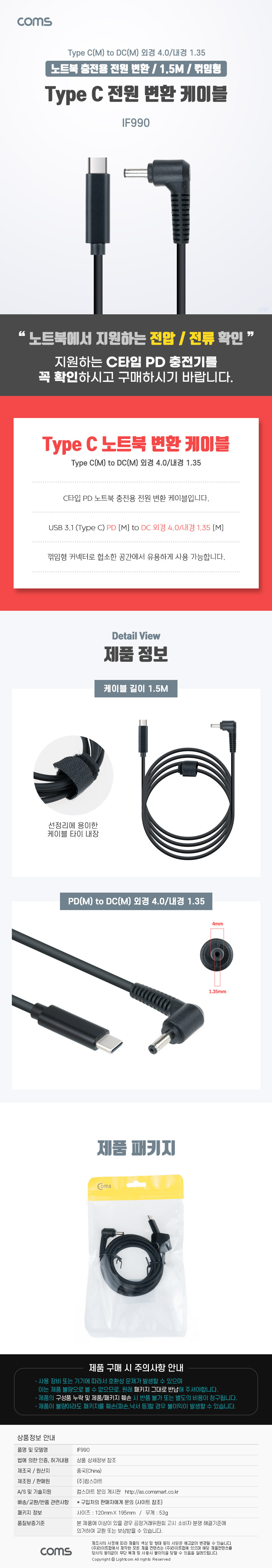 [301936]Coms(ÄĽº) USB 3.1(Type C) ³ëÆ®ºÏ Àü¿ø º¯È¯ ÄÉÀ̺í(PD to DC 4.0/1.35), ÃæÀü, Á¨´õ, DC ¿Ü°æ 4.0/³»°æ 1.35, 1.5¹ÌÅÍ(1.5m) [IF990]