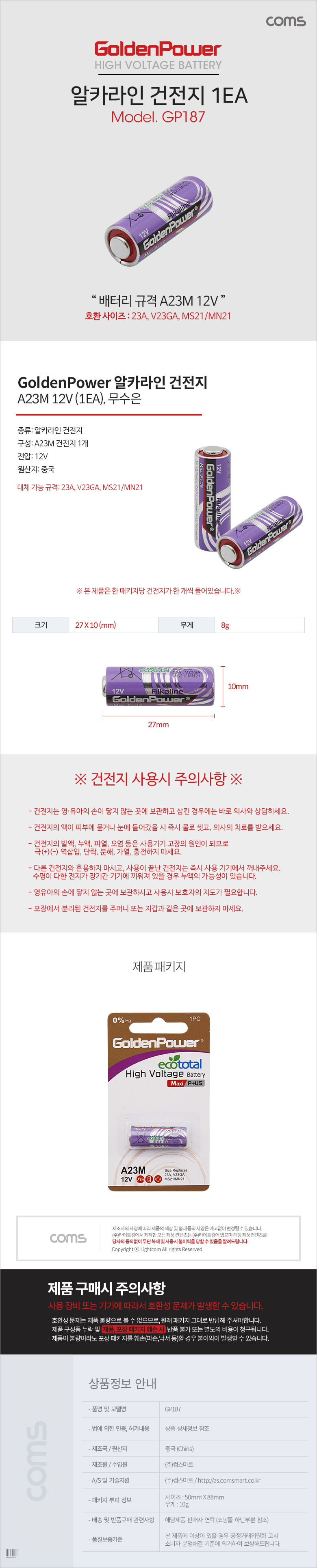 [ǰÀý][290355]Coms(ÄĽº) °ÇÀüÁö GP (A23M) 1ea, 12V [GP187]
