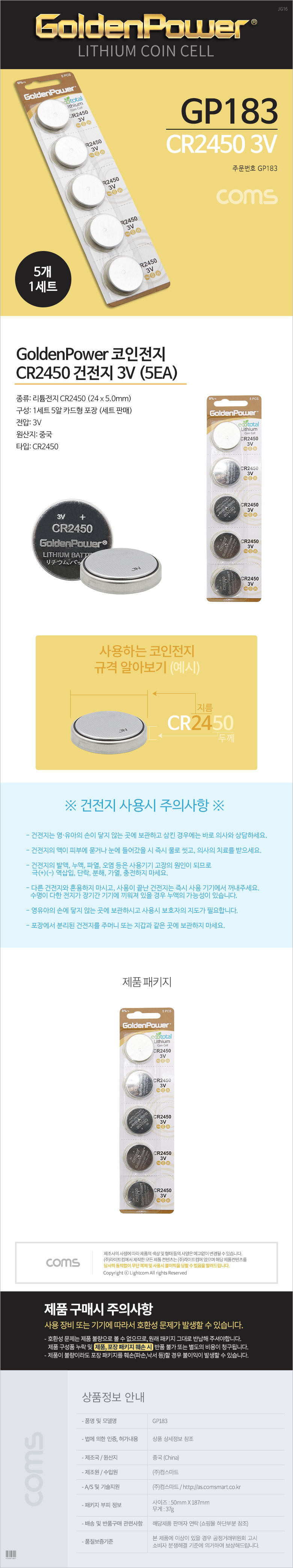 [290341]Coms(ÄĽº) °ÇÀüÁö GP ÄÚÀÎÀüÁö(CR2450) 5ea 3.0V/¸®Æ¬ ÄÚÀμ¿ [GP183]