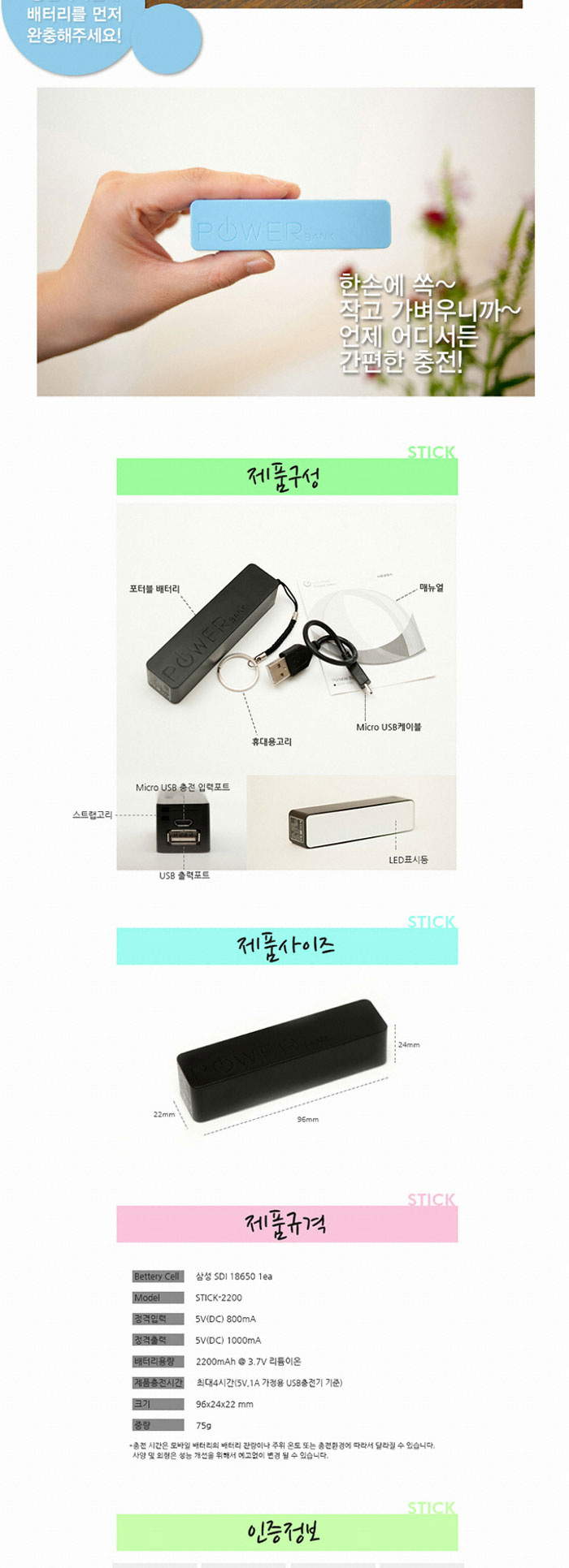 º¸Á¶¹èÅ͸® / 2,200mAh / ¸®Æ¬Æú¸®¸Ó / ÀÔ·Â: 5V 0.8A / Ãâ·Â: 5V 1A / ÃæÀü½Ã°£: ÃÖ´ë4½Ã°£ / Å©±â: 96 x 24 x 22mm / ¹«°Ô: 75g