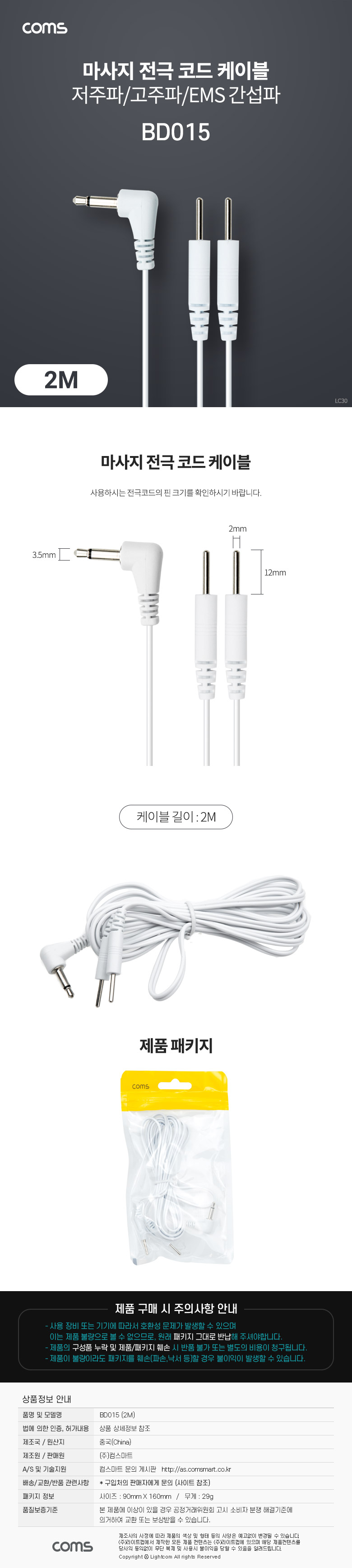 [300873]Coms(ÄĽº) ¸¶»çÁö Àü±Ø ÄÚµå ÄÉÀ̺í, ÀúÁÖÆÄ/°íÁÖÆÄ/EMS °£¼·ÆÄ Ä¡·á±â, 3.5mm, 2¹ÌÅÍ(2m) [BD015]