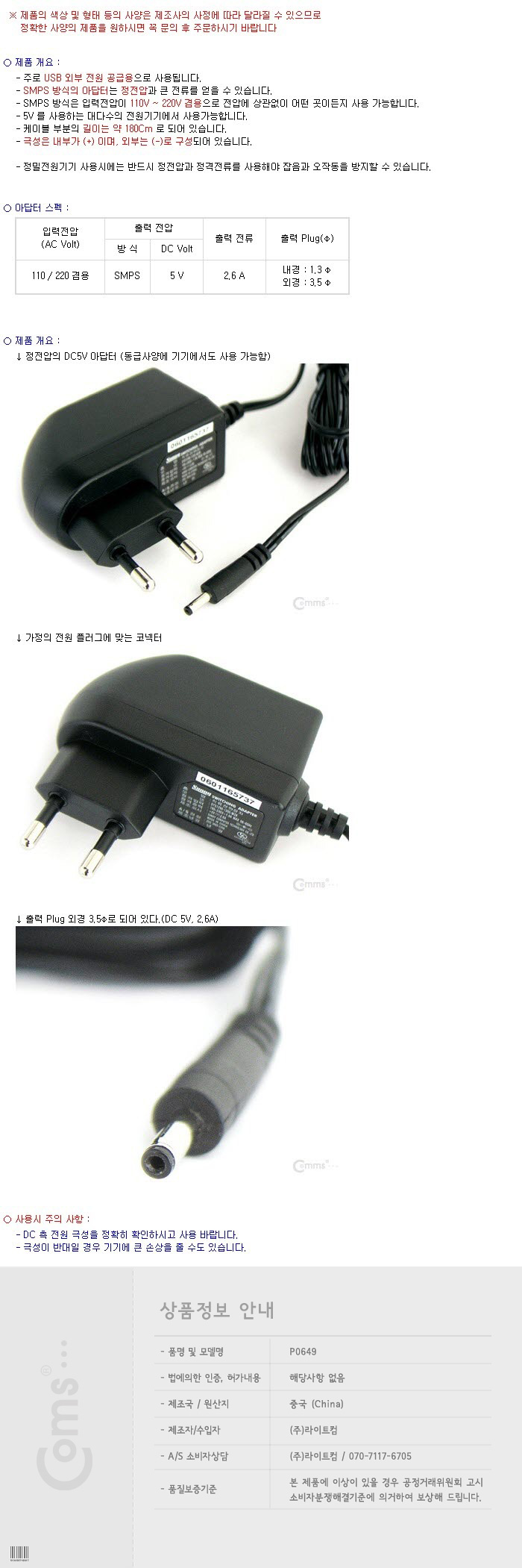 [ǰÀý][109876]Coms(ÄĽº) ¾Æ´äÅÍ (Á¤Àü¾Ð) DC 5V/1A, (3.5-1.3) [P9561]