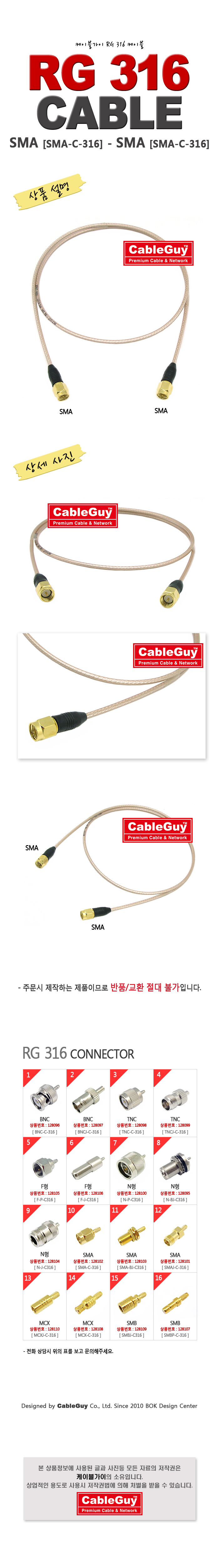 | ¡á ÄÉÀÌºí°¡ÀÌ(CableGuy) RG-316(50¿È)ÄÉÀ̺í SMA(¼ö/¼öÇÉ)-SMA(¼ö/¼öÇÉ)Àº 0.5m~15m±îÁö ÀÖ½À´Ï´Ù ¡á |