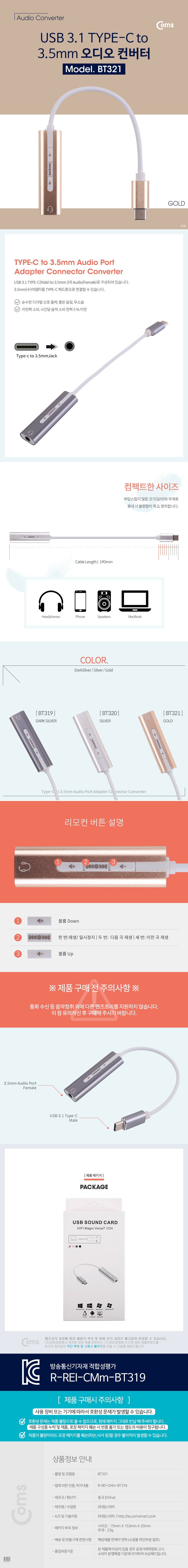 [287605]Coms(ÄĽº) Type C ¿Àµð¿À(7.1) ÄÁ¹öÅÍ/3.5 - ST ÄÉÀ̺íÇü, Metal/Gold [BT321]