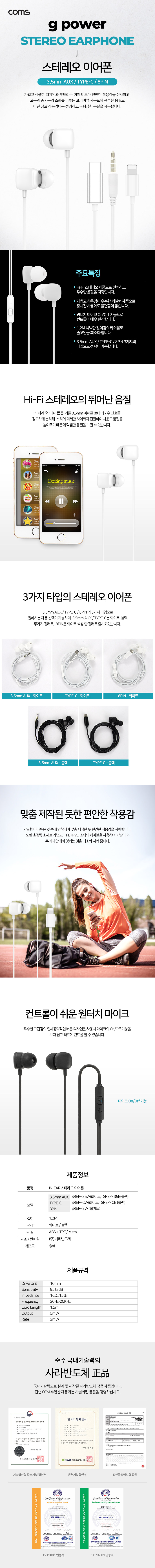 [303109]Coms(ÄĽº) G POWER ÀÎÀ̾î ŸÀÔ À̾îÆù, ½ºÅ×·¹¿À, 3.5mm ½ºÅ×·¹¿À, White(ÈÀÌÆ®) »ö»ó, 1.2¹ÌÅÍ(1.2m) [SR2370]