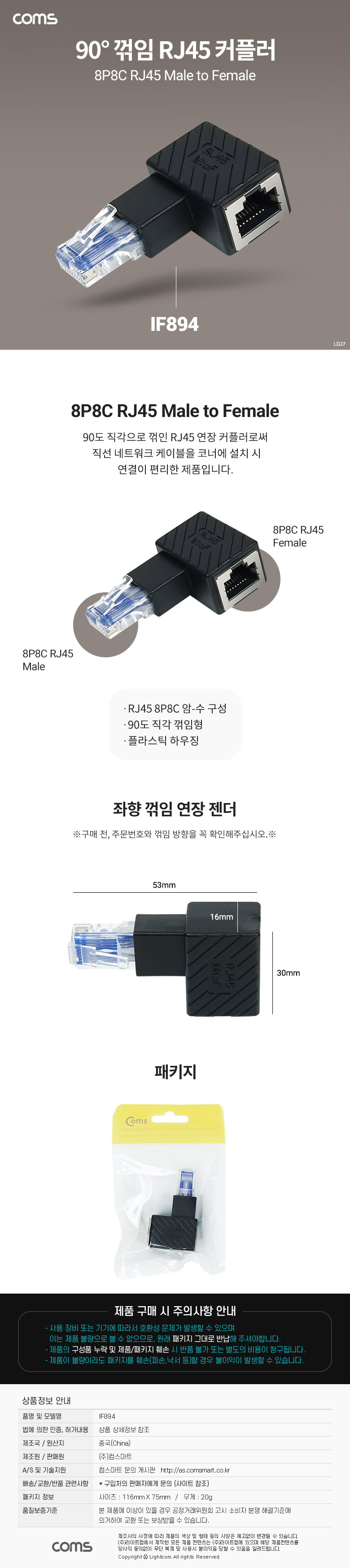 | ¡á Coms(ÄĽº) RJ45 ¿¬Àå Ä¿Ç÷¯ 8P8C Male to Female, 90µµ ²ªÀÓ Á¨´õ´Â ´Ù¾çÇÑ »óǰÀÌ ÀÖ½À´Ï´Ù ¡á |