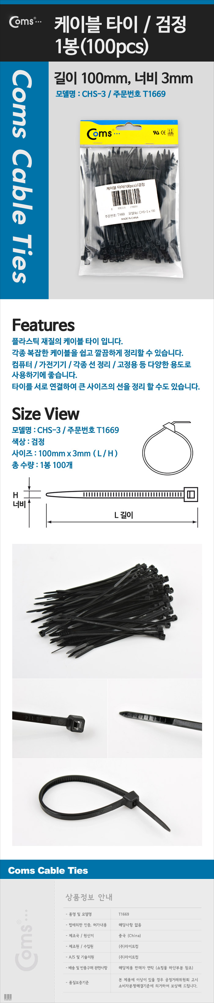 [157154]Coms(ÄĽº) ÄÉÀ̺íŸÀÌ(1ºÀ/100pcs) CHS-3 °ËÁ¤ 100mm x 3mm [T1669]