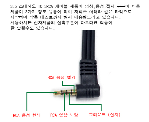 3.5ŸÀÔÀ¸·Î ¹Ù·Î º¯È¯Àº µÇÁö ¾Ê°í RCA(³ë¶û)·Î Ãâ·ÂµÇ¸ç ¸ð¾ßÀ» ¹Ù²ãÁÖ´Â Á¨´õ¸¦ ¿¬°áÇØ¾ß ÇÕ´Ï´Ù.