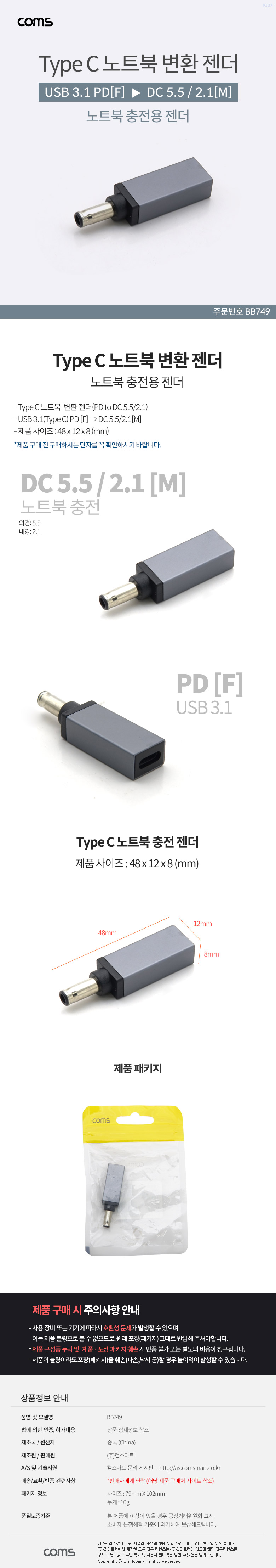 [ǰÀý][298184]Coms(ÄĽº) USB 3.1(Type C) ³ëÆ®ºÏ Á¨´õ(PD to DC 5.5/1.7) [BB750]