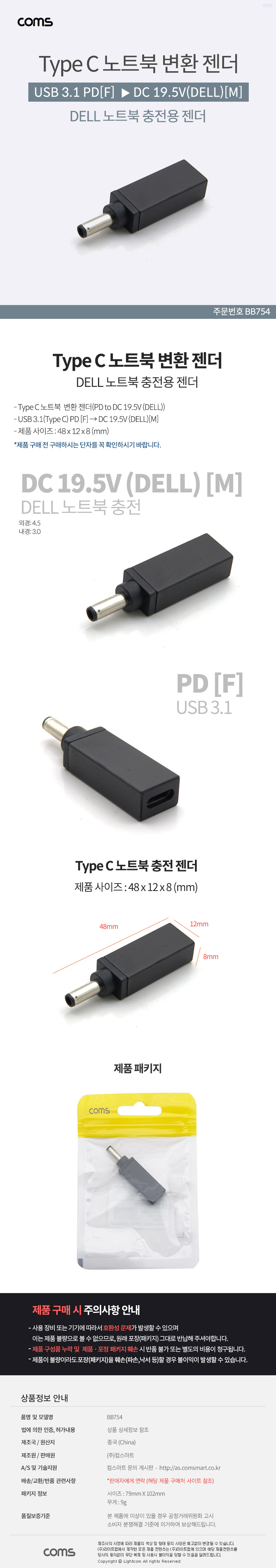 [298188]Coms(ÄĽº) USB 3.1(Type C) ³ëÆ®ºÏ Á¨´õ [PD to DC 19.5V(DELL¿ë)] [BB754]