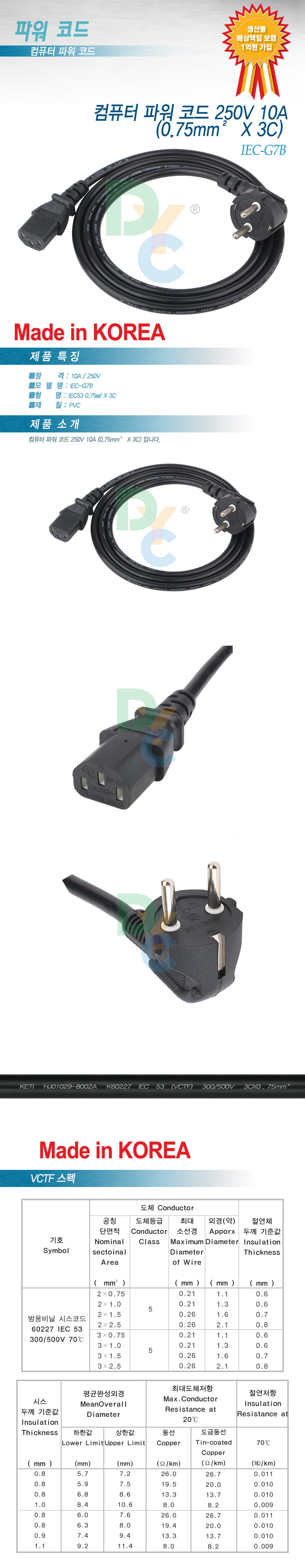 [117556]DYC(µ¿¾ç) ÄÄÇ»ÅÍ ÆÄ¿ö ÄÚµå ÄÉÀ̺í 250V 10A (0.75mm©÷ X 3C) ±¹»ê[MADE IN KOREA] 1.5¹ÌÅÍ(1.5m)