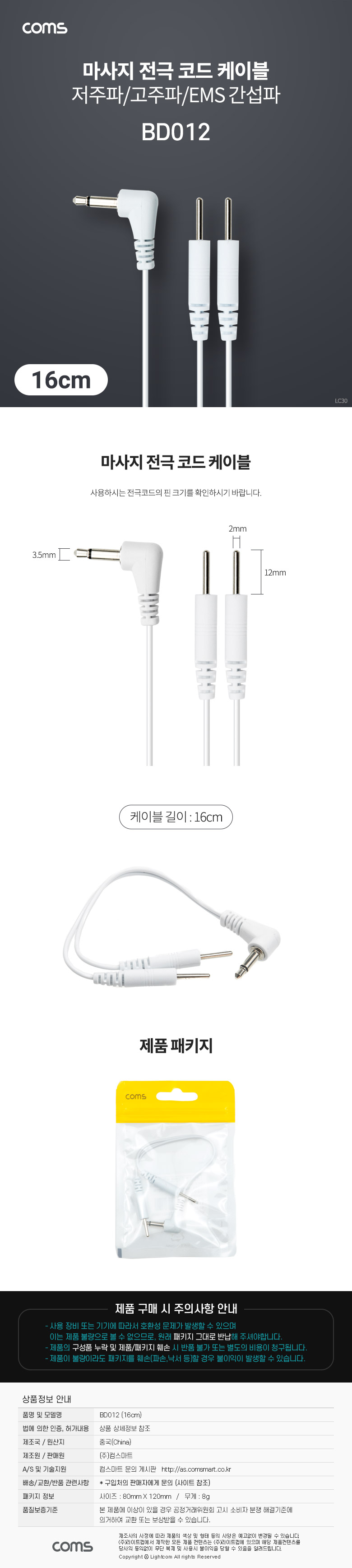 [300876]Coms(ÄĽº) ¸¶»çÁö Àü±Ø ÄÚµå ÄÉÀ̺í, ÀúÁÖÆÄ/°íÁÖÆÄ/EMS °£¼·ÆÄ Ä¡·á±â, 3.5mm, 0.16¹ÌÅÍ(0.16m) [BD012]