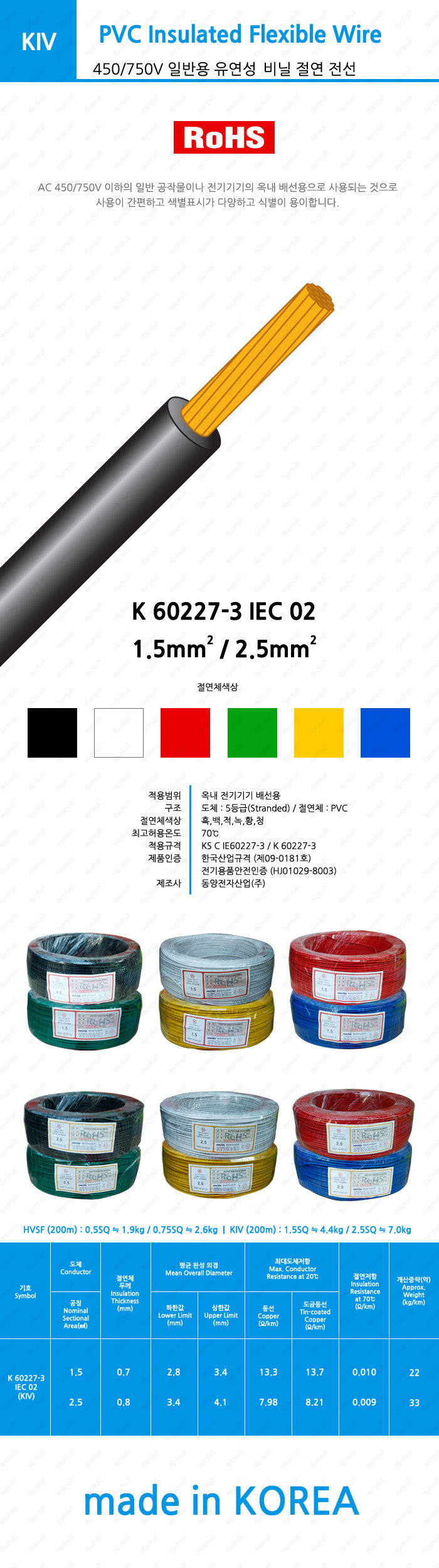 [153598]DYC(µ¿¾ç) KIV 2.5mm©÷ 450/750V ÀϹݿë À¯¿¬¼º ºñ´Ò Àý¿¬ Àü¼±ÄÉÀ̺í 200¹ÌÅÍ(200m) û»ö [KIV-25]