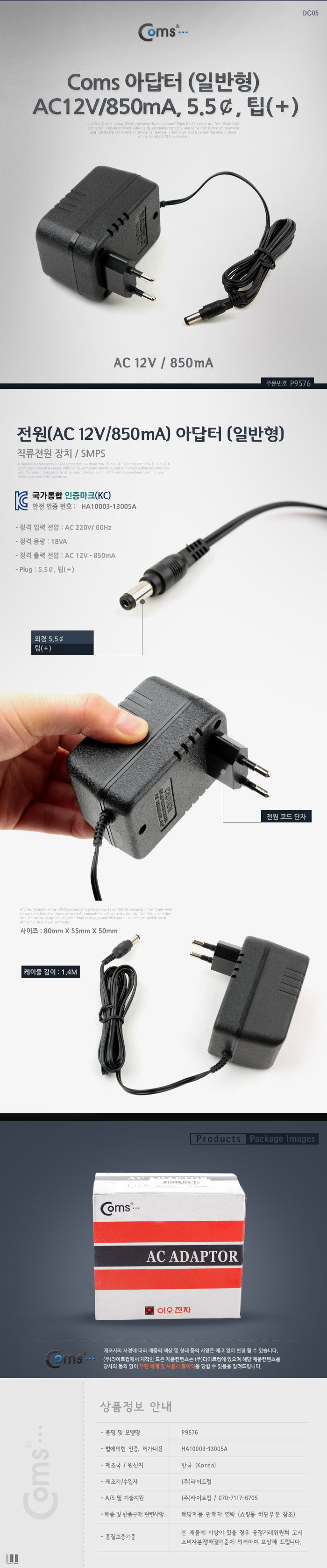 [109881]Coms(ÄĽº) Àü¿ø ¾Æ´äÅÍ (AC12V/850mA/5.5¡Ë) [P9576]