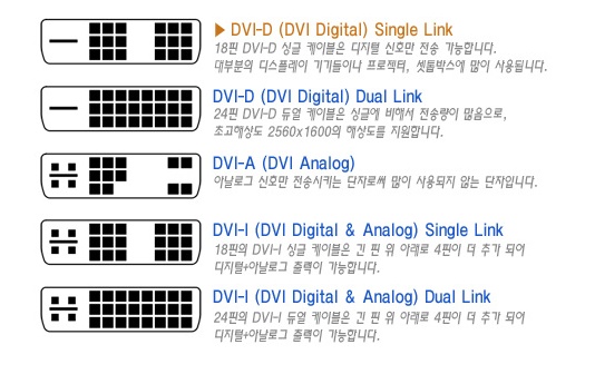 : DVI´Â °íǰÀ§ ¿µ»óÀü¼Û ±â¼ú·Î¼ ÃÖ°í±Þ¿µ»ó Àü¼Û¿¡ ÇÊ¿äÇÑ Cable »ç¾çÀÌ´Ù. (´ëÇü Æò¸é ¸ð´ÏÅÍ¿¡ Àû¿ë) : Digital Àü¼Û ¼Óµµ : 4.95Gbps or 9.9Gbps : Analog´Â Coaxial Line »ç¿ë.