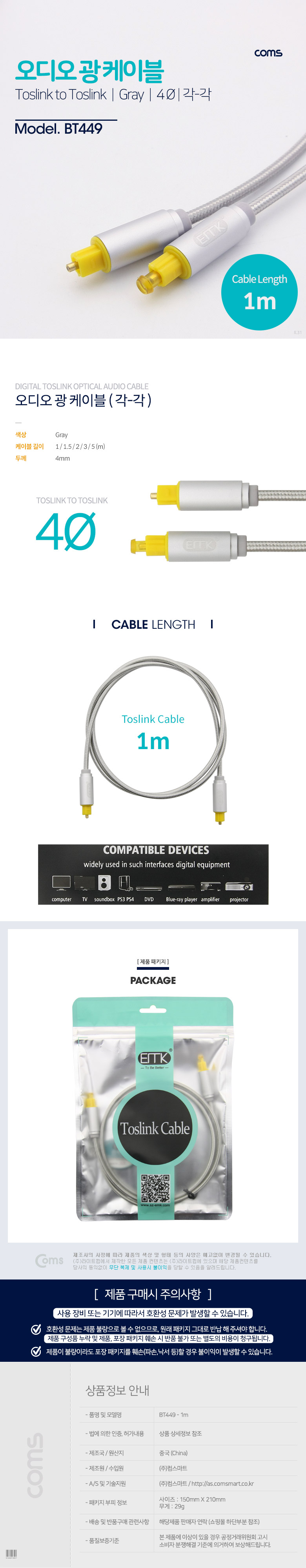 [285787]Coms(ÄĽº) ¿Àµð¿À±¤ÄÉÀ̺í(EMK/Gray) °¢/°¢ 1¹ÌÅÍ(1m) - 4¢±, Toslink to Toslink [BT449]