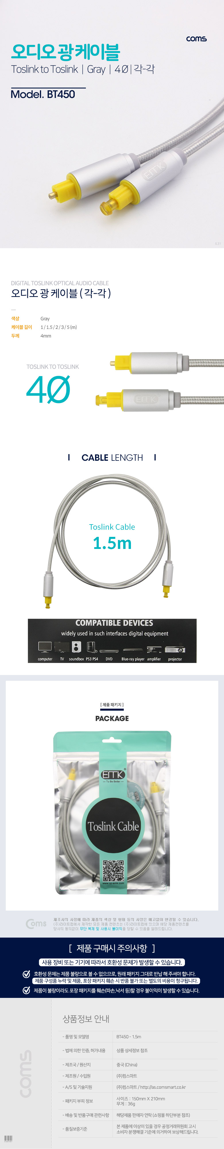 [285788]Coms(ÄĽº) ¿Àµð¿À±¤ÄÉÀ̺í(EMK/Gray) °¢/°¢ 1.5¹ÌÅÍ(1.5m) - 4¢±, Toslink to Toslink [BT450]