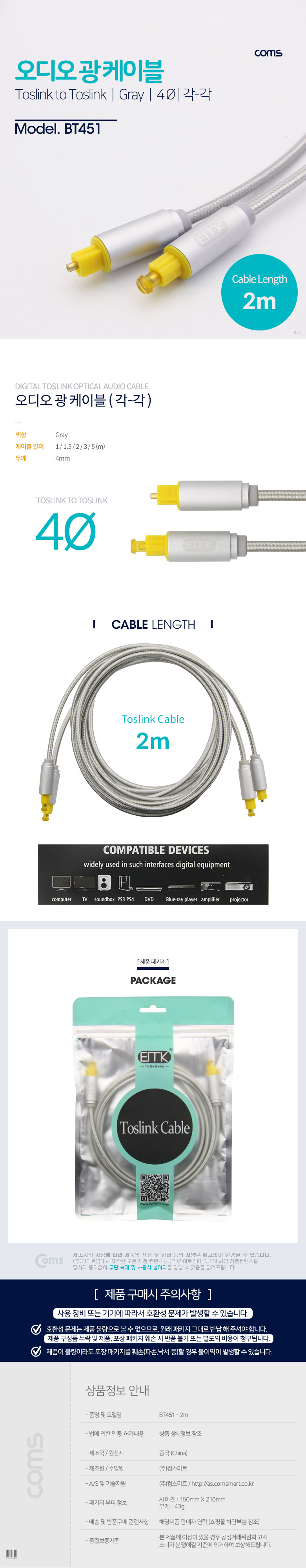 [285789]Coms(ÄĽº) ¿Àµð¿À±¤ÄÉÀ̺í(EMK/Gray) °¢/°¢ 2¹ÌÅÍ(2m) - 4¢±, Toslink to Toslink [BT451]