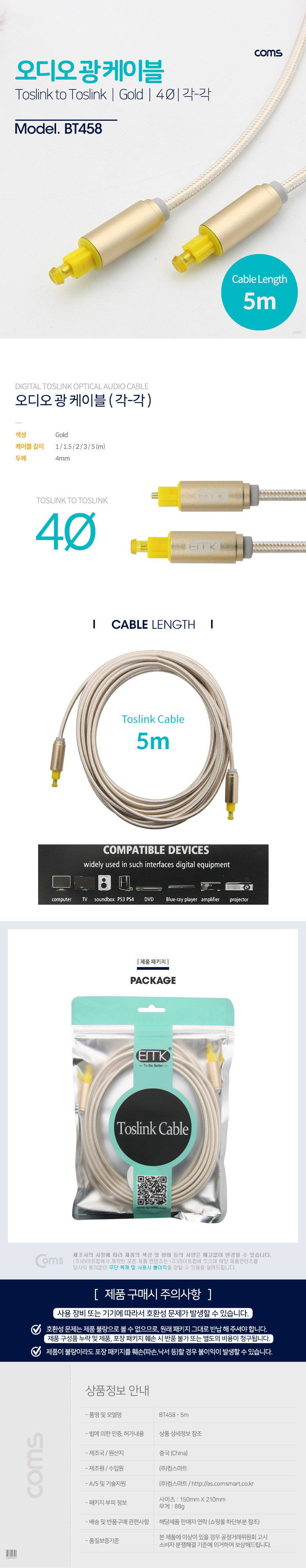 [ǰÀý][285797]Coms(ÄĽº) ¿Àµð¿À±¤ÄÉÀ̺í(EMK/Gold) °¢/°¢ 5¹ÌÅÍ(5m) - 4¢±, Toslink to Toslink [BT458]