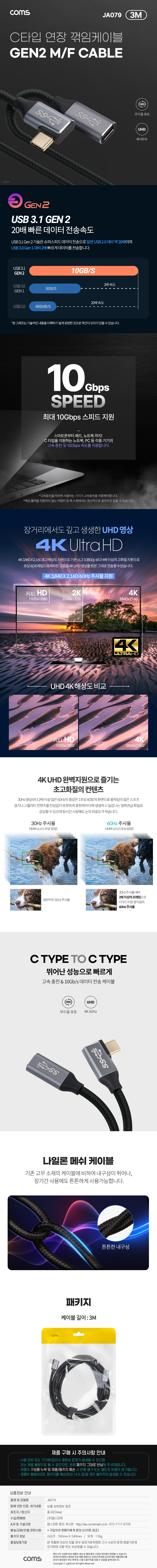 [311881]Coms(ÄĽº) USB Type-C GEN2 ¿¬Àå(M/F) ²©ÀÓÇü PDÃæÀü,µ¥ÀÌÅÍ ÄÉÀ̺í/4K 60Hz UHDÁö¿ø 3¹ÌÅÍ(3m) [JA079]