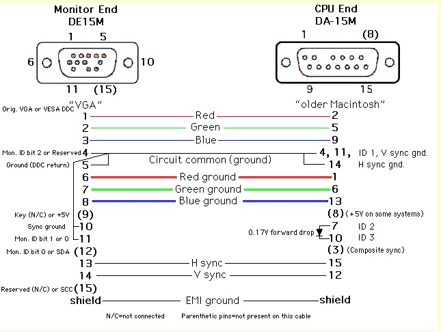 For those not familiar with older Macintosh sense codes, these pins (ID 1-3 or sense line 0-2¡¦ same thing) were individually or in combination connected to ground or each other on older Mac monitors, in order to tell the main unit (CPU box) what monitor was connected and its resolution abilities. By the mid-1990s Apple had run out of combinations, so multi-scan monitors such as the MS1705 use one or two diodes in either the cable connector (as here) or the monitor to further extend the system. The MS1705 cable needs one diode connected with cathode (marking band) connected to pin 10 of the DA-15M (ID 3), and the anode (no mark) connected to pin 7 (ID 2). ID 1 (pin 4) needs to be connected to circuit common (ground) to complete the correct sensing scheme.