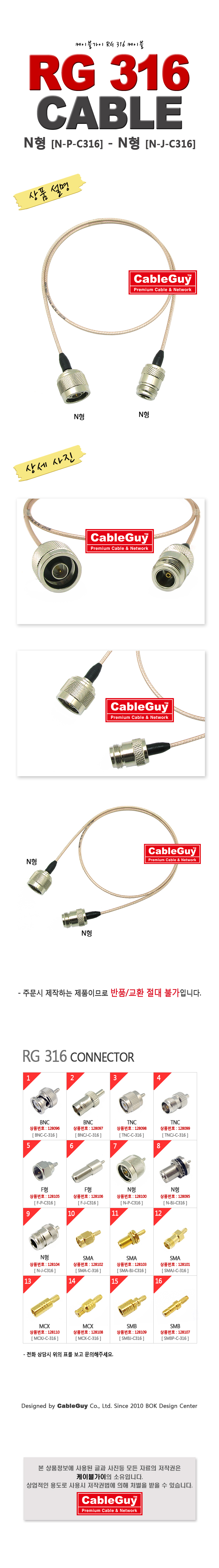 | ¡á ÄÉÀÌºí°¡ÀÌ(CableGuy) RG-316(50¿È)ÄÉÀ̺í NÇü(¼ö)-NÇü(¾Ï)Àº 0.5m~15m±îÁö ÀÖ½À´Ï´Ù ¡á |