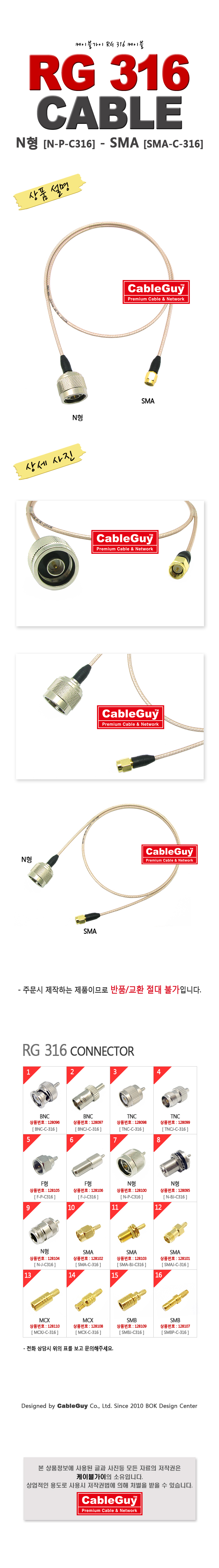 | ¡á ÄÉÀÌºí°¡ÀÌ(CableGuy) RG-316(50¿È)ÄÉÀ̺í NÇü(¼ö)-SMA(¼ö/¼öÇÉ)Àº 0.5m~15m±îÁö ÀÖ½À´Ï´Ù ¡á |