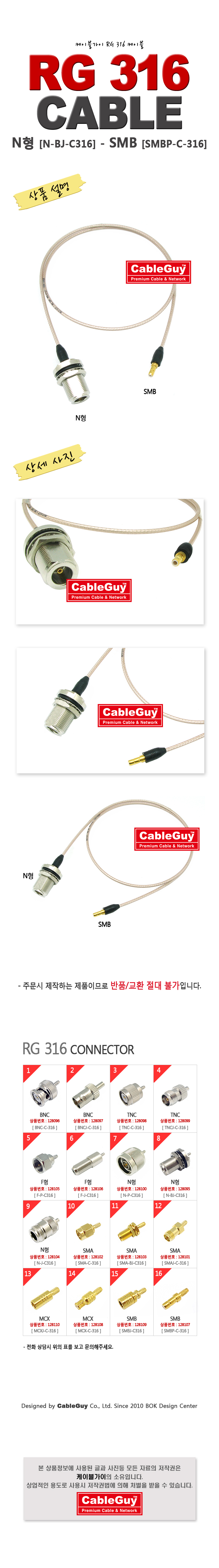 | ¡á ÄÉÀÌºí°¡ÀÌ(CableGuy) RG-316(50¿È)ÄÉÀ̺í NÇü(³ª»ç½Ä ¾Ï)-SMB(¾Ï/¼öÇÉ)Àº 0.5m~15m±îÁö ÀÖ½À´Ï´Ù ¡á |