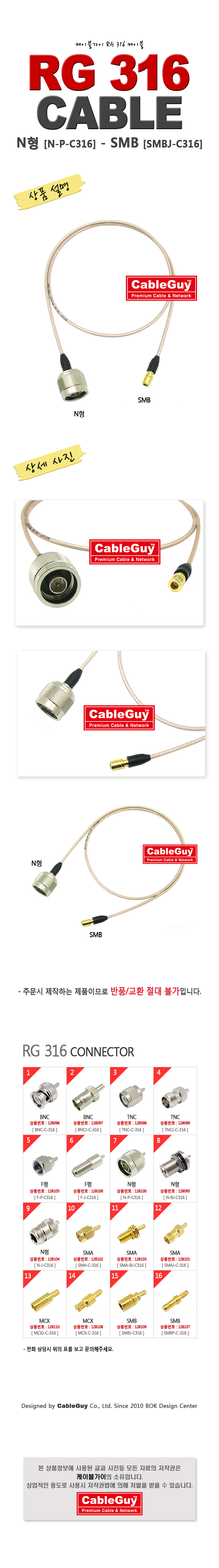 | ¡á ÄÉÀÌºí°¡ÀÌ(CableGuy) RG-316(50¿È)ÄÉÀ̺í NÇü(¼ö)-SMB(¼ö/¾ÏÇÉ)Àº 0.5m~15m±îÁö ÀÖ½À´Ï´Ù ¡á |
